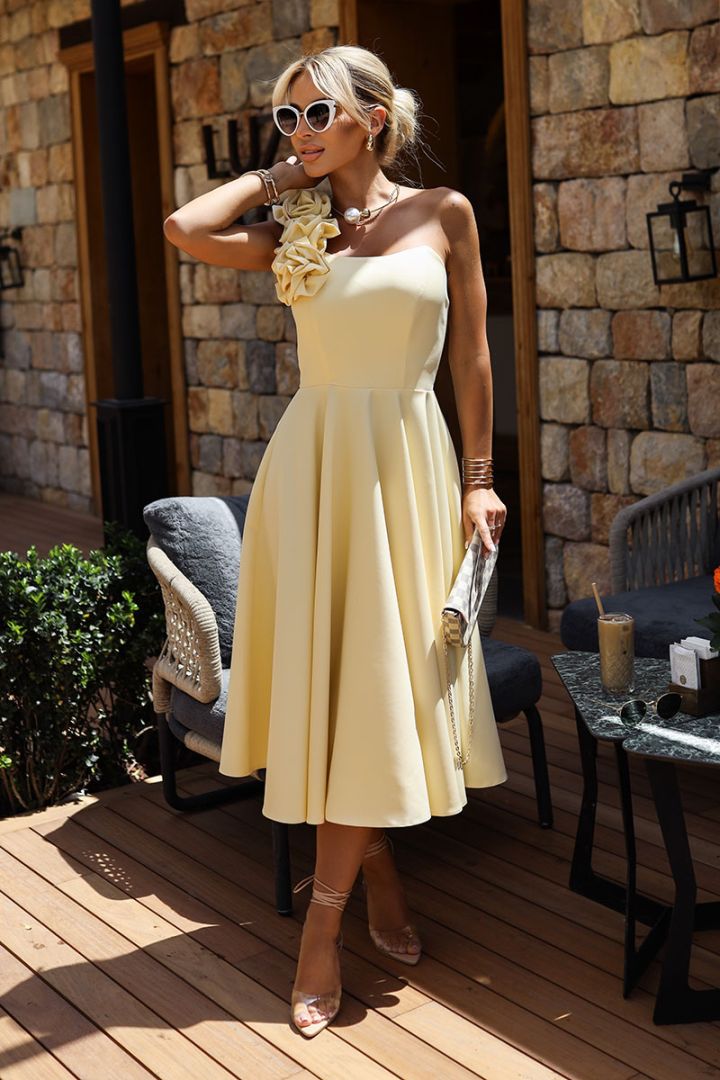 Beżowa sukienka wizytowa maskująca niedoskonałości - Nicolette