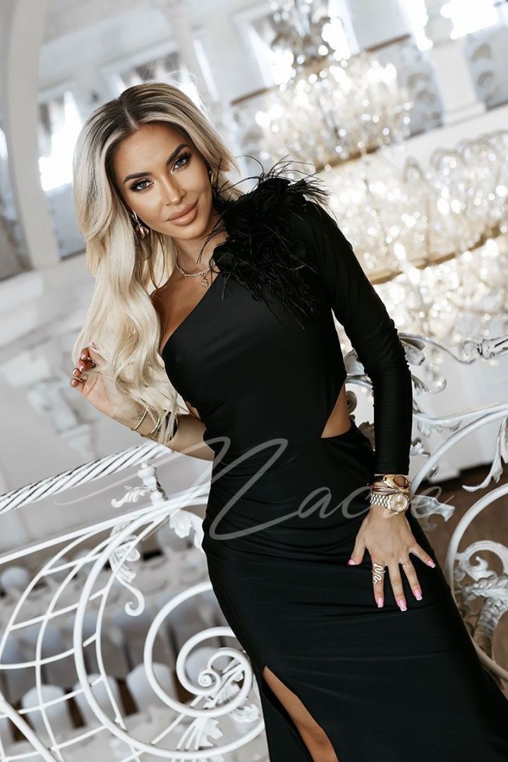 The feathers at one shoulder add lightness and unusual character, and the classic deep black color makes you always look elegant and sensual. In this dress you don't just dazzle with your looks - in it you feel like the star of the evening.