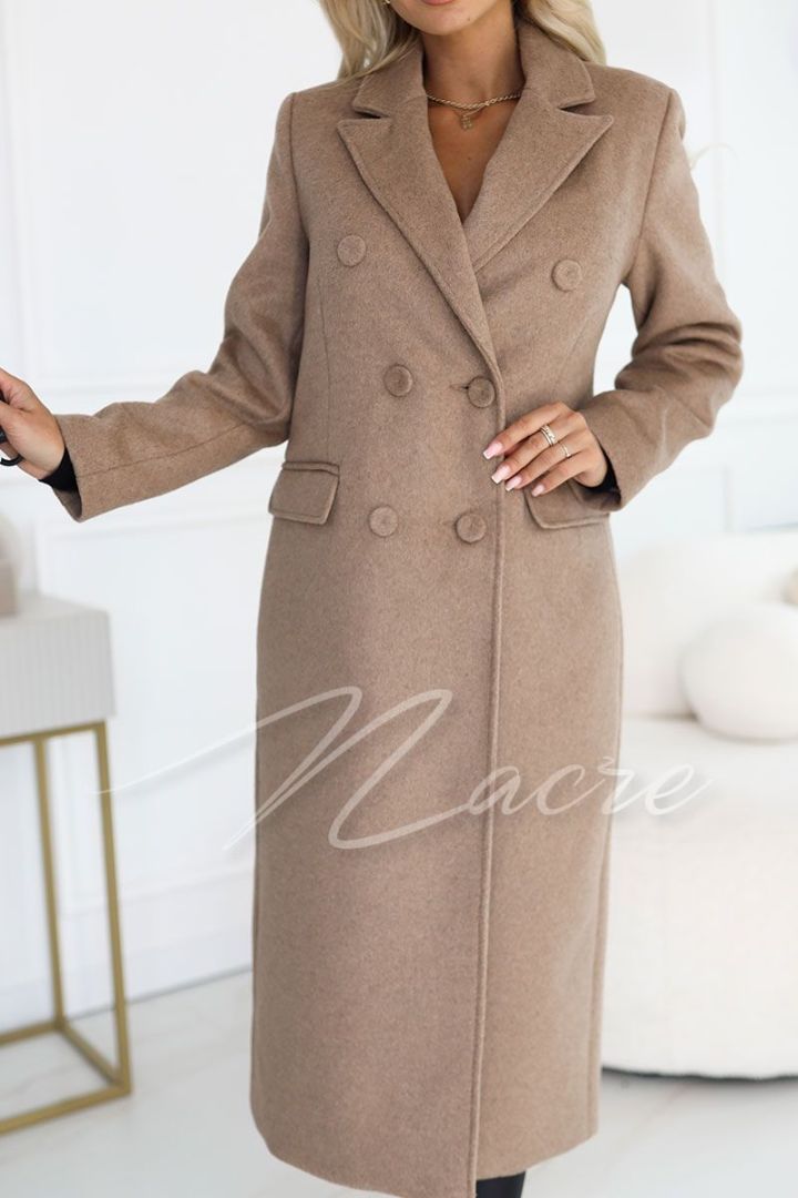 The diplomat-type cut with a subtle waistline beautifully accentuates the silhouette, while the double-breasted closure and elegant collar add a chic touch. The beige color adds lightness and class to the styling, blending well with clothes in light and dark tones.