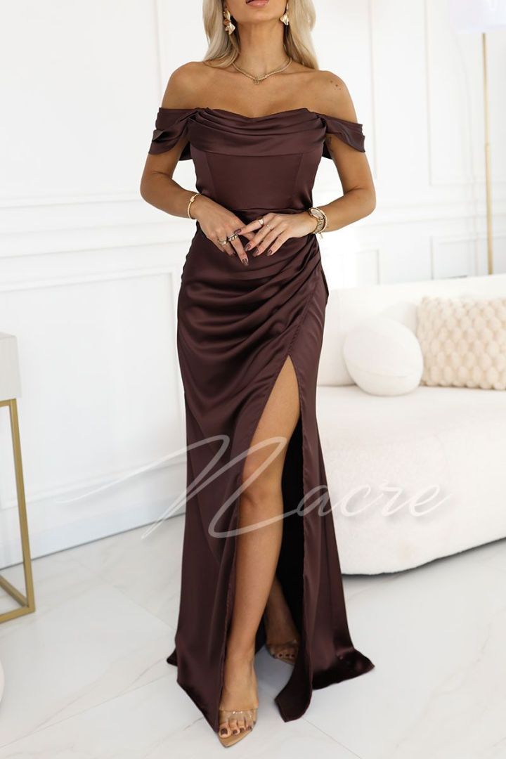 The Alia model is the perfect choice for women looking for an evening dress, prom dress, New Year's Eve dress or wedding dress that combines femininity, elegance and the subtle luxury of satin. If you dream of a chocolate satin dress with a water neckline, Alia will make every moment unforgettable.