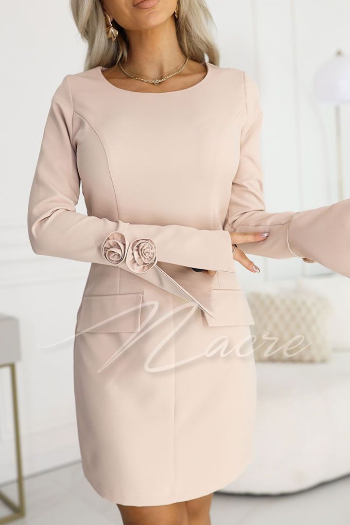 Beige dress before the knee with decorative flower and long sleeve - Linda