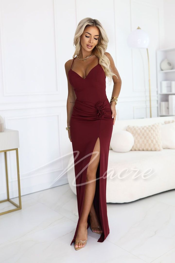 Bordowa sukienka maxi na ramiączkach z ozdobnymi kwiatami - Roxi