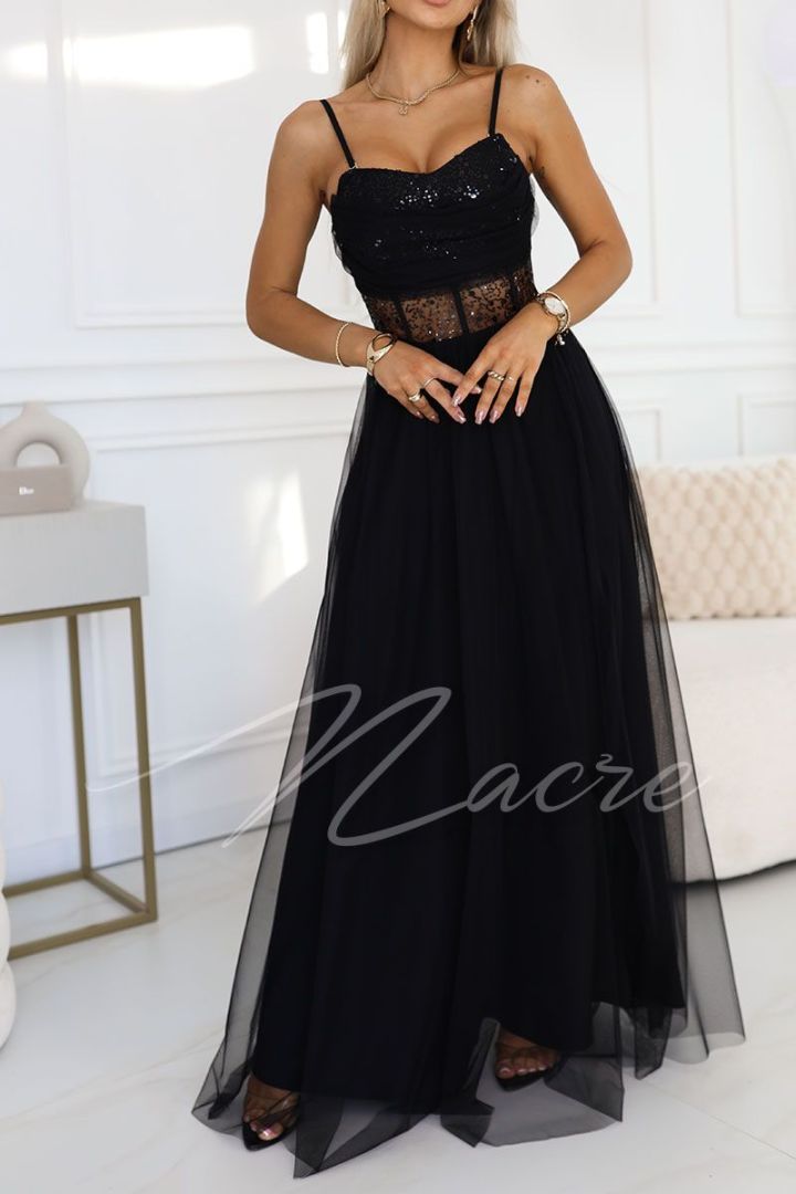 Grenade tulle maxi dress with sequin bodice - Stella. Feel the magic of every moment in the navy blue Stella tulle dress. This unique model combines the lightness of tulle with the elegance of a sequin corset, which subtly accentuates the waist and adds sparkle with every movement. This is the perfect dress for proms, weddings or evening parties, in which you will feel like a real star. The long tulle skirt adds lightness and romance, while the sequined bodice draws the eye and adds confidence. If you are looking for a tulle dress with a sequin corset that will impress and make your evening unforgettable - Stella is a choice you can't miss.