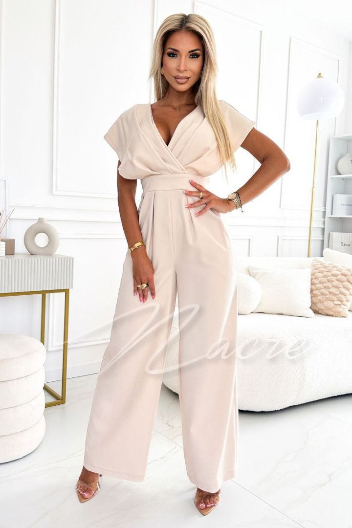 Beige women's jumpsuit with wide leg and water neckline - Ella
