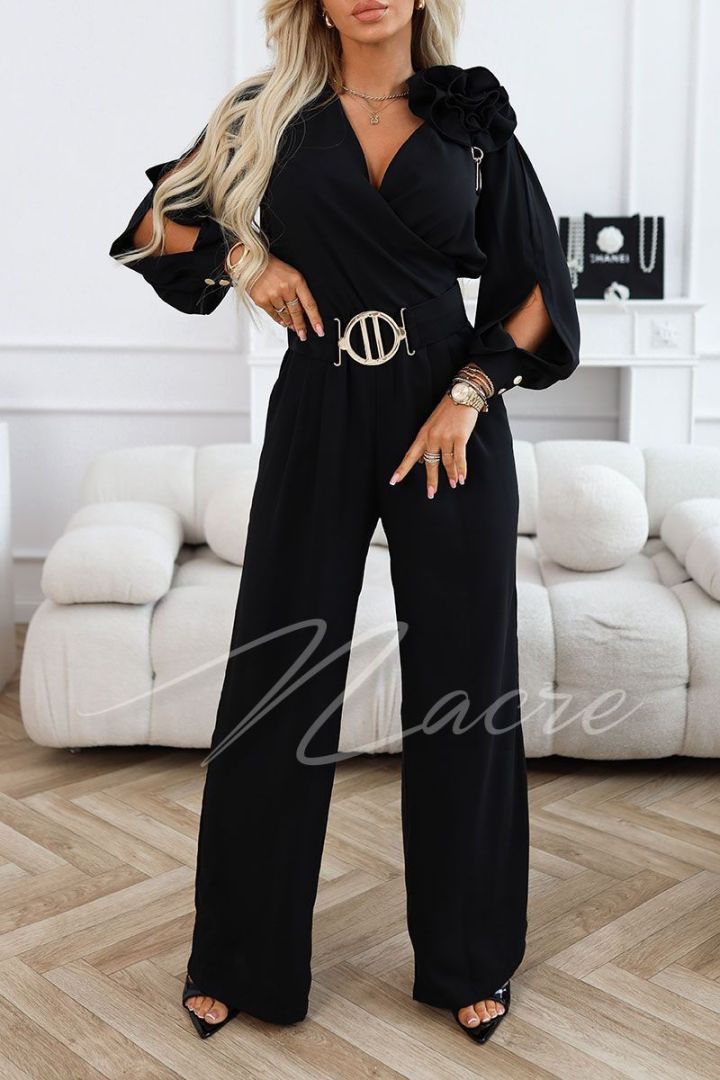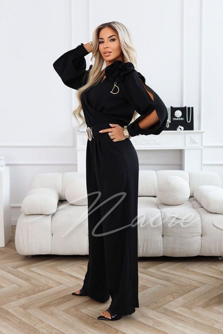 Black women's jumpsuit with wide leg and decorative belt - Fama