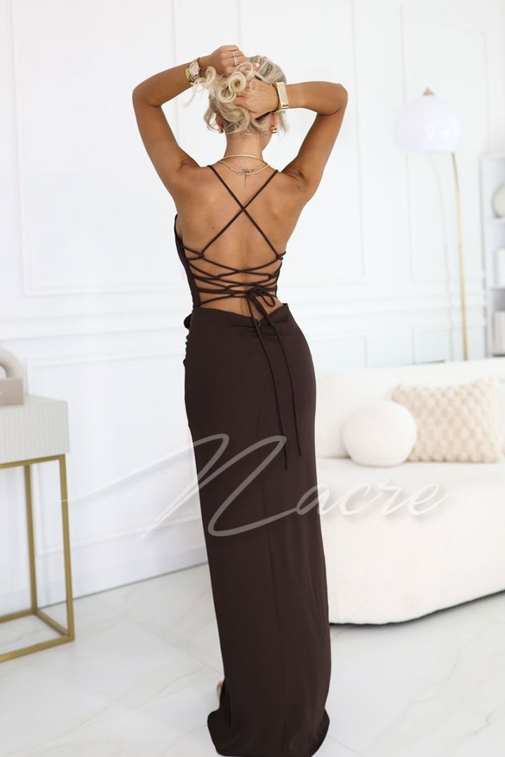 Dazzle with elegance in a chocolate maxi evening dress by Roxi, created for prom, New Year's Eve, wedding or an elegant party. Delicate straps beautifully emphasize the silhouette, and decorative flowers give the dress a romantic and feminine touch. This chocolate maxi dress combines chic, comfort and fashionable design to make you feel special at any special moment.