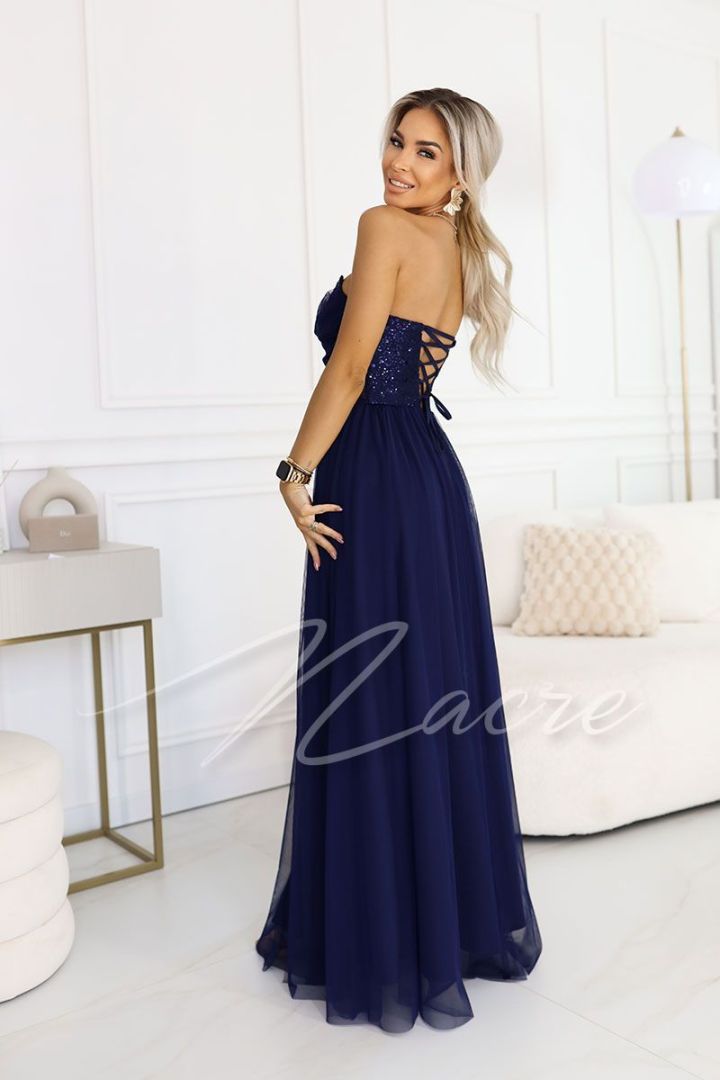 Grenade tulle maxi dress with sequin bodice - Stella. Feel the magic of every moment in the navy blue Stella tulle dress. This unique model combines the lightness of tulle with the elegance of a sequin corset, which subtly accentuates the waist and adds sparkle with every movement. This is the perfect dress for proms, weddings or evening parties, in which you will feel like a real star. The long tulle skirt adds lightness and romance, while the sequined bodice draws the eye and adds confidence. If you are looking for a tulle dress with a sequin corset that will impress and make your evening unforgettable - Stella is a choice you can't miss.