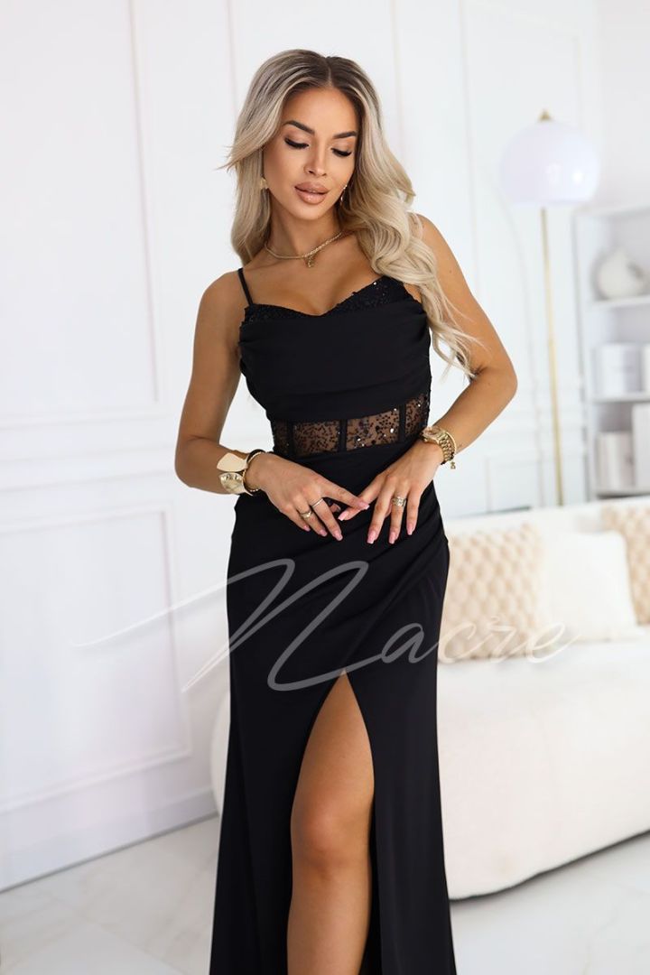 Black long dress with a flower on a wider shoulder strap flared - Anabel