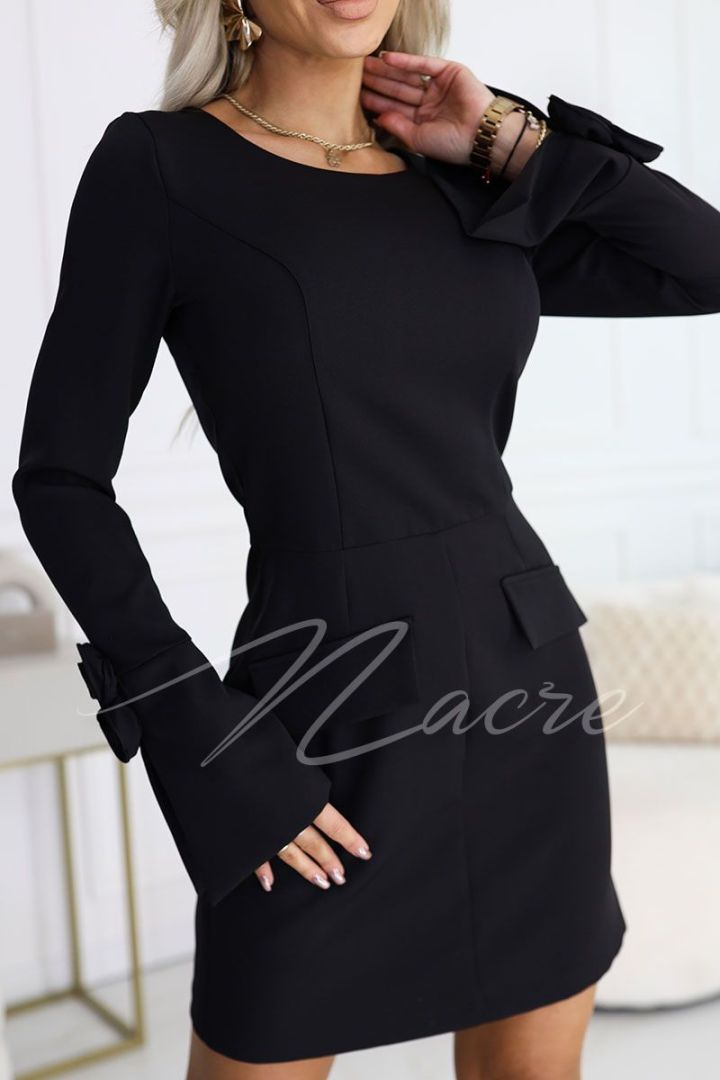 Black formal dress before the knee with roses on the sleeves - Etna. Feel the timeless elegance in classic black. Etna formal dress impresses with its below-the-knee length and long sleeves decorated with subtle roses that add feminine charm. Perfect for weddings, christenings, communion or elegant parties when you want to look stylish, classy and confident. If you are looking for a black formal dress that will emphasize your style and uniqueness - Etna model will be a hit.