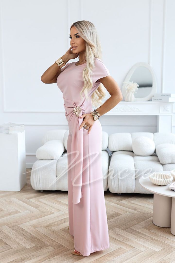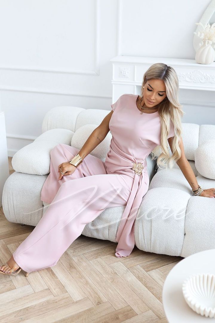 Pink elegant women's set with midi skirt and blouse with rhinestones - Mireja
