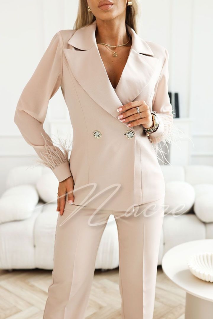 Jasnobeżowy elegancki garnitur damski z piórami na rękawach - Loreta