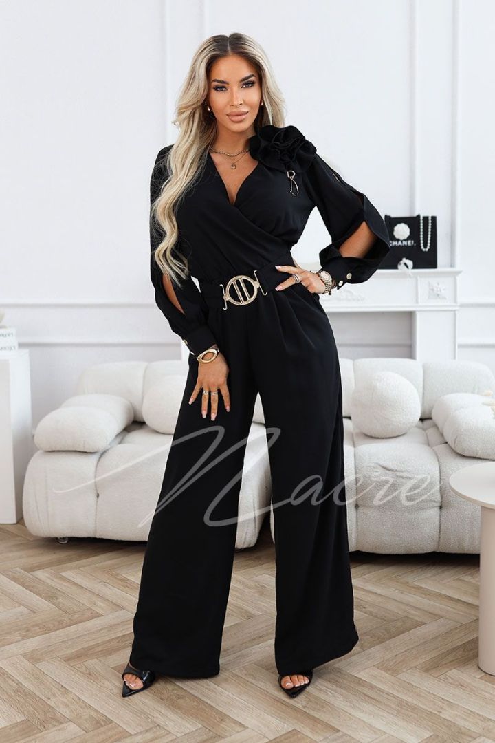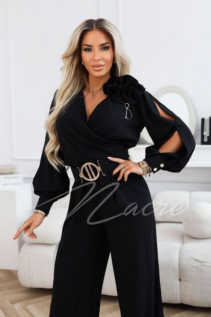 Czekoladowy kombinezon damski z szeroką nogawką i ozdobnym paskiem - Fama