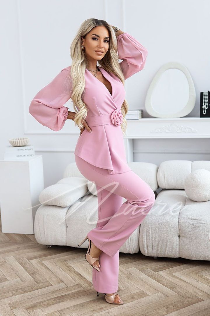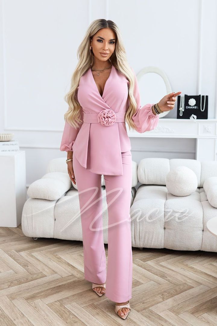 Różowy komplet damski z krótką marynarką i spodniami z wysokim stanem - Letty