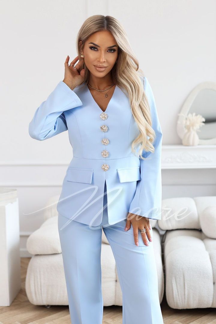 Błękitny komplet damski z krótką marynarką i spodniami z wysokim stanem - Letty