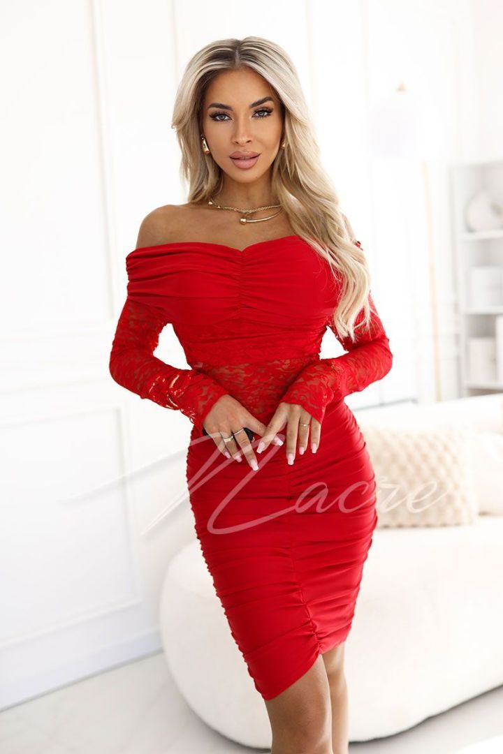 Czerwona dopasowana sukienka mini z kwiatem na dekolcie - Versi