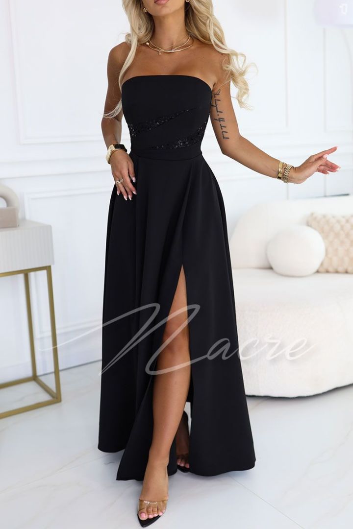 Stalowo-niebieska sukienka maxi asymetryczna z poświatą - Loren