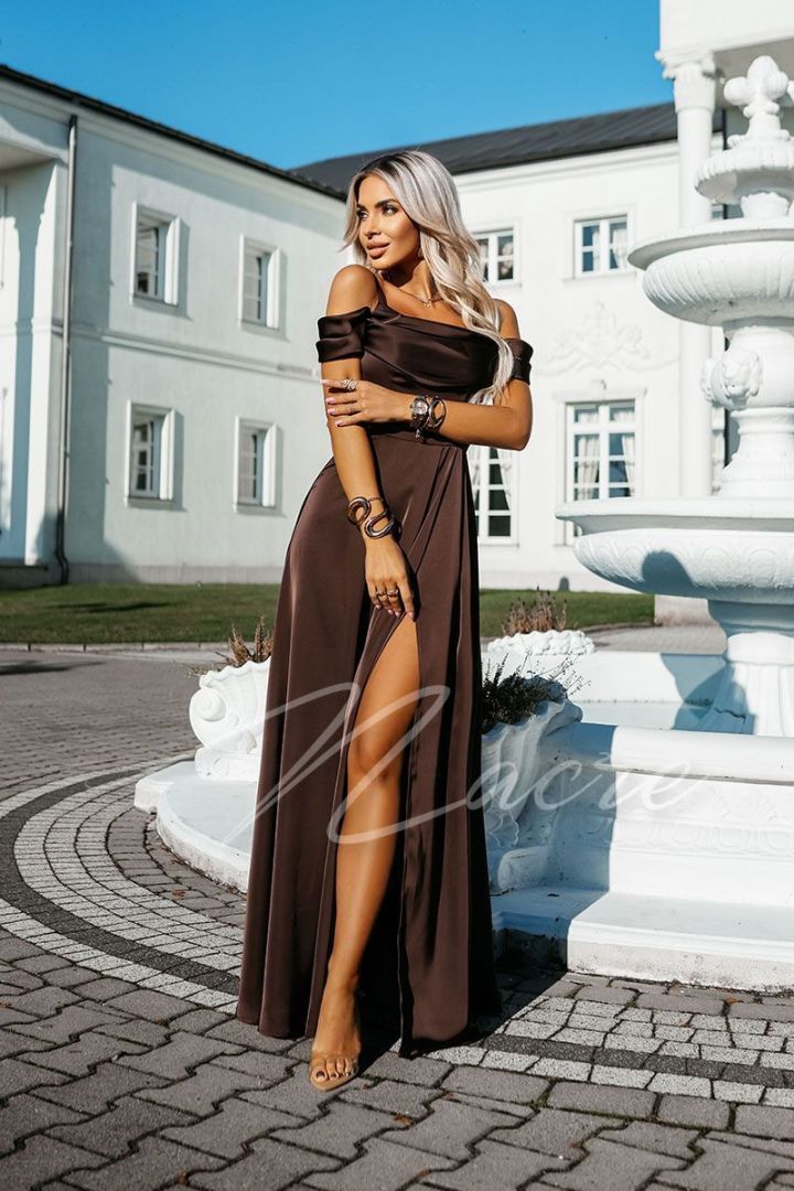Czekoladowa sukienka maxi na jedno ramię ze sznurowaniem na pleach - Gracja
