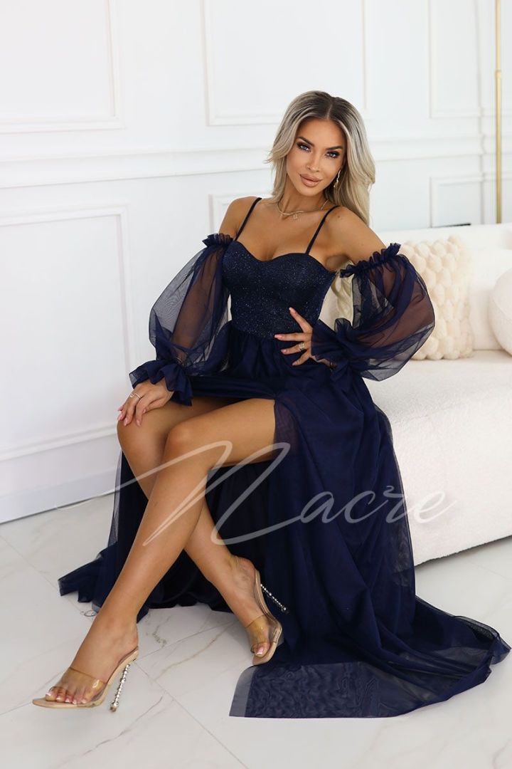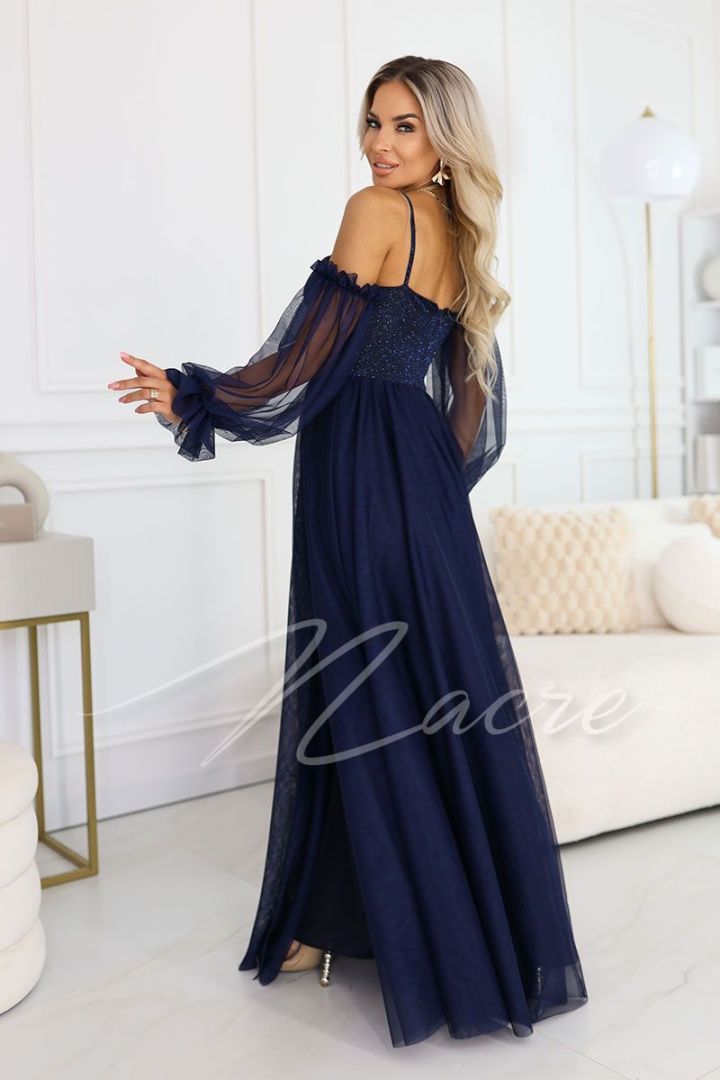 Stalowo-niebieska sukienka maxi asymetryczna z poświatą - Loren
