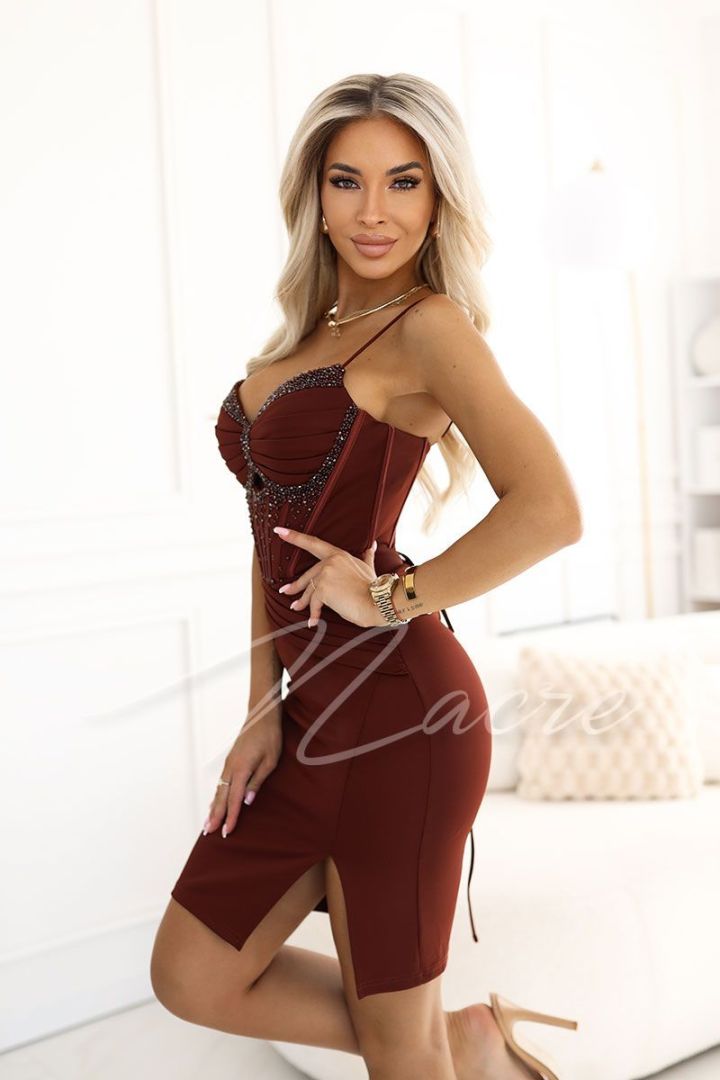 Bordowa sukienka o kroju rybki z dekoltem z cyrkoniami - Monica