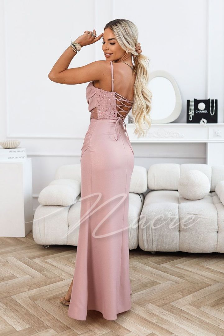 Czekoladowa sukienka wieczorowa z cekinowym gorsetem i dekoltem woda - Fayola