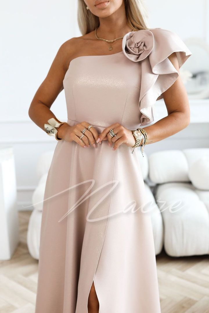 Różowa sukienka długa z kwiatem na szerszym ramiączku rozkloszowana - Anabel