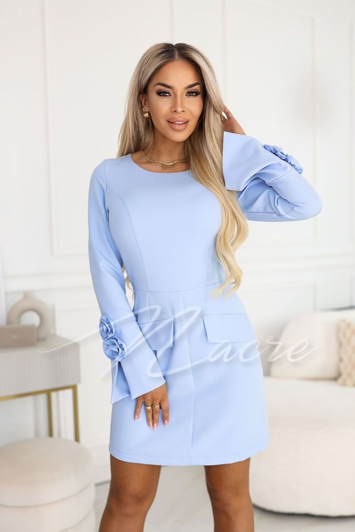 Czekoladowa sukienka przed kolano z ozdobnym kwiatem i długim rękawem - Linda