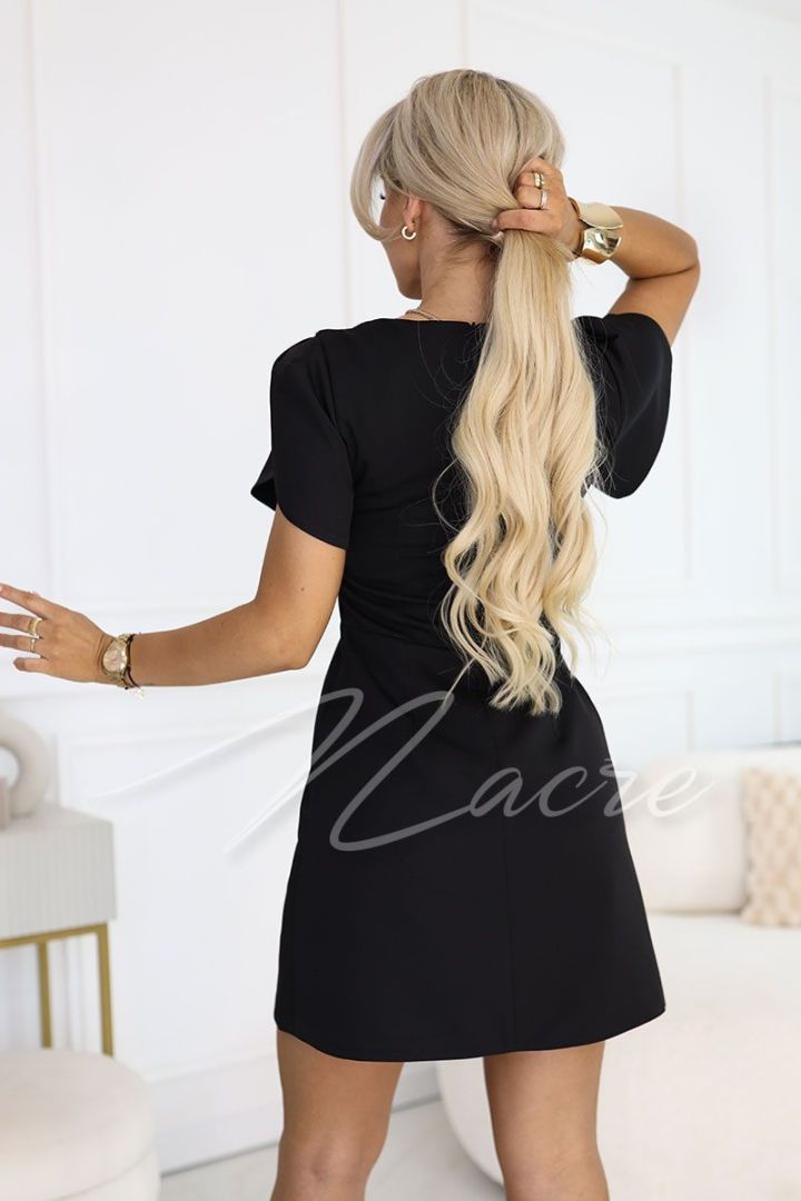 Czarna dopasowana sukienka mini z kwiatem na dekolcie - Versi
