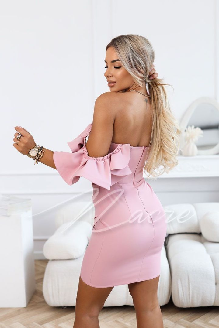 Różowa sukienka rozkloszowana z opadającymi ramionami na wesele - Briana