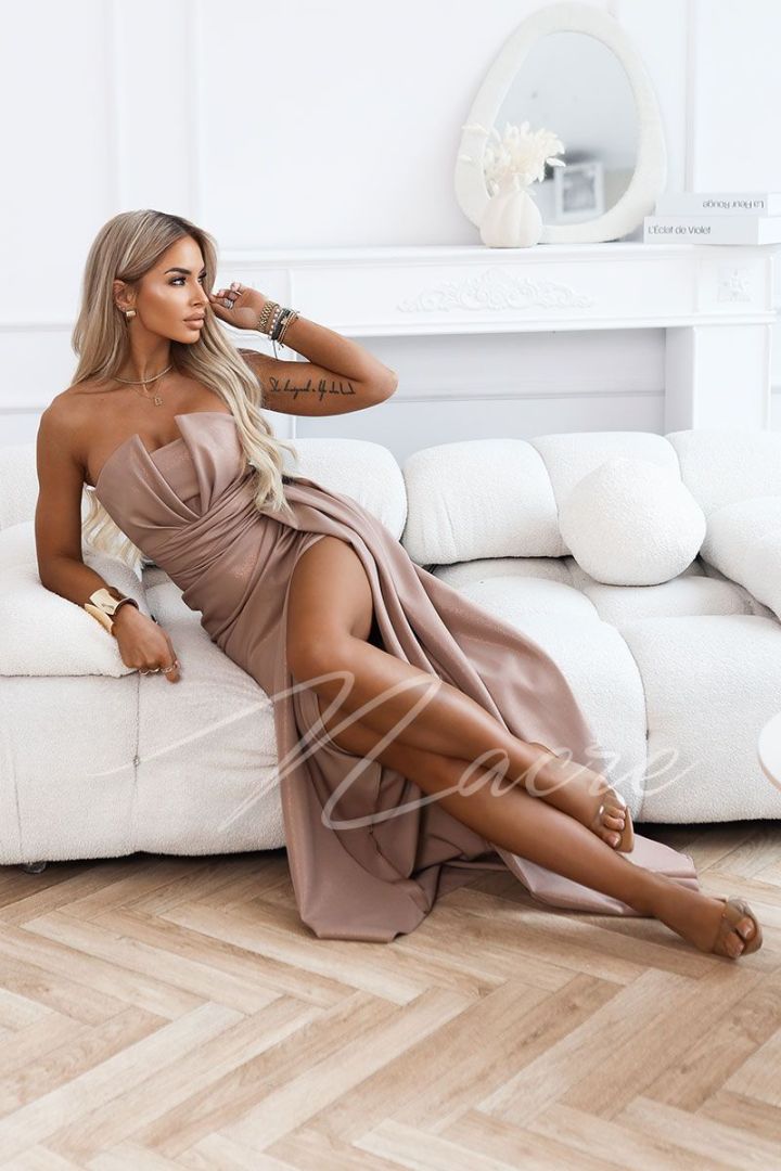 Biskupioróżowa sukienka maxi z tiulowym rękawem na jedno ramię - Kinga